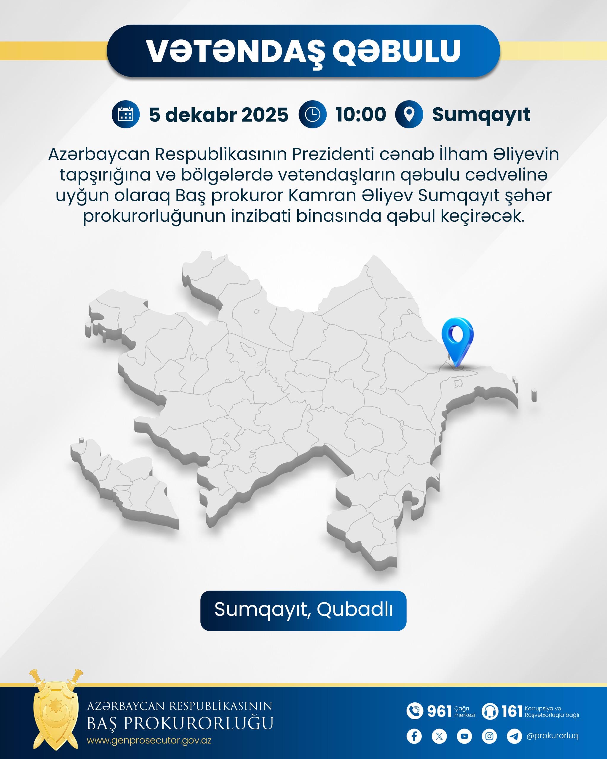Azərbaycan Respublikasının Prezidenti cənab İlham Əliyevin tapşırığına və bölgələrdə vətəndaşların qəbulu cədvəlinə uyğun olaraq Baş prokuror Kamran Əliyev saat 10:00-da Sumqayıt şəhər prokurorluğunun inzibati binasında Sumqayıt şəhər və Qubadlı rayon sakinlərinin qəbulunu keçirəcək.
