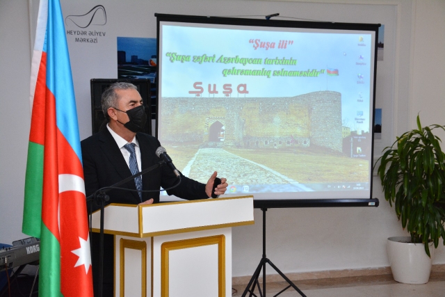 Torpaqlarımızın ərazi bütövlüyü uğrunda həlak olan şəhidlərimizin ruhunun 1 dəqiqəlik sükutla yad edilməsi ilə başlanan tədbirdə Rayon İcra Hakimiyyətinin Başçısı Sevindik Hətəmov Prezident İlham Əliyevin yanvarın 5-də imzaladığı Sərəncama əsasən 2022-ci ilin “Şuşa ili” elan edilməsi ölkə başçısının Azərbaycan xalqının tarixi, mədəni-mənəvi irsinə verilən böyük qiymət və dəyərin bariz nümunəsi olduğunu vurğulamışdır. Rayon rəhbəri çıxışında qeyd etmişdir ki, ölkəmizin dünya birliyində getdikcə artan reytinqi, ordu quruculuğunun inkişafına verilən xüsusi önəm və uğurlu xarici siyasət bu inamı gerçəkliyə doğru addım-addım yaxınlaşdırırdı. Möhtərəm cənab Prezident, Müzəffər Ali Baş Komandan İlham Əliyevin rəhbərliyi ilə torpaqlarımız, o cümlədən Şuşa işğaldan azad edildi. Bu sevinci xalqımıza yaşatdığı üçün Müzəffər Ali Baş Komandan İlham Əliyevə, rəşadətli Ordumuza, şəhidlərimizə və qazilərimizə hər zaman minnətdar olacağıq. Daha sonra tədbirdə çıxış edən Vətən Müharibəsi Qəhrəmanı Zaur Hüseynov Qarabağın tacı olan Şuşanın qəhrəmanlıqla alınmasından söz açmış, ordumuzun Vətən müharibəsində qazandığı tarixi qələbə, Şuşanın azad edilməsi Azərbaycan hərb tarixinin ən yaddaqalan, şanlı səhifələrindən olduğunu vurğulamışdır. Sonra Şuşaya həsr olunan “Şuşa sən azadsan” sənədli film nümayiş olunmuşdur.