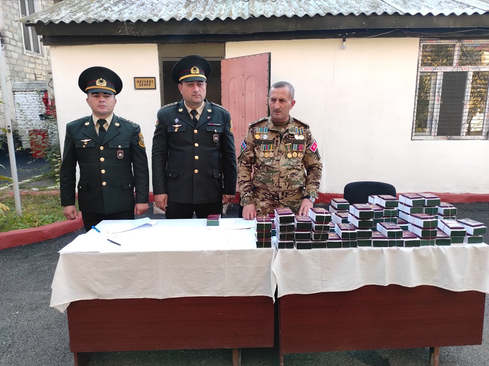 Daha sonra Vətən müharibəsində şəhid olan hərbi qulluqçuların ailə üzvlərinə, qazilərə,həmçinin müharibə iştirakçılarına Prezident, Silahlı Qüvvələrin Ali Baş Komandanı İlham Əliyevin müvafiq Sərəncamı ilə verilən medal və vəsiqələr təqdim edilib.
